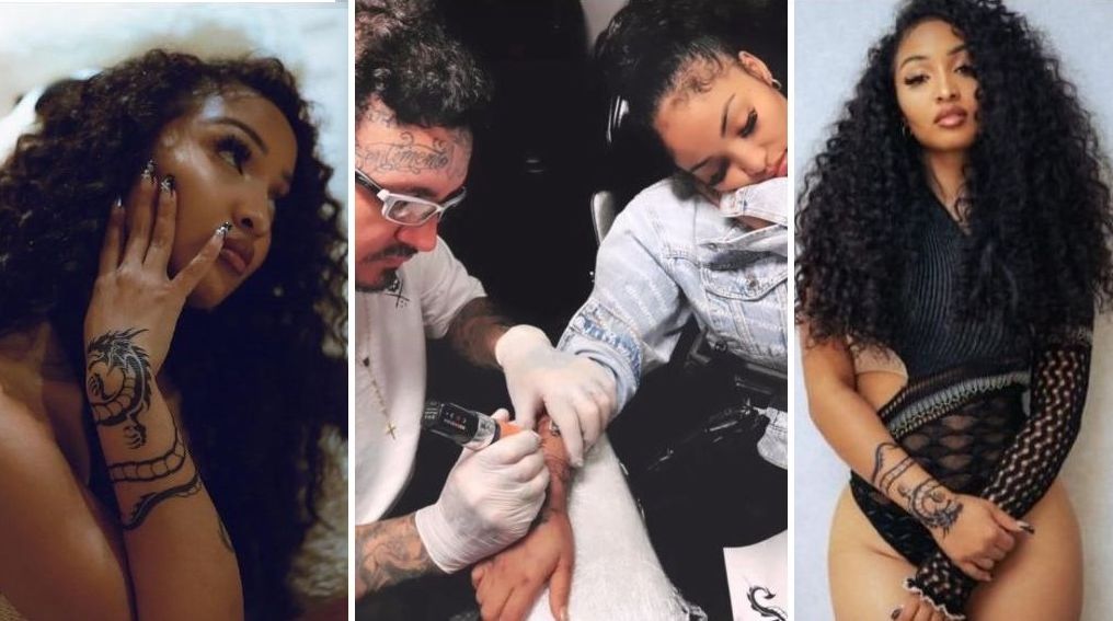 A cantora de jamaicana Shenseea, compartilhou nas redes sociais, a tatuagem de um dragão na mão direita, feita pelo excelente tatuador brasileiro, Rogério Araújo, que vive na Florida há muitos anos, onde tem um estúdio de tattoo na 824 Washington, coração de Miami.