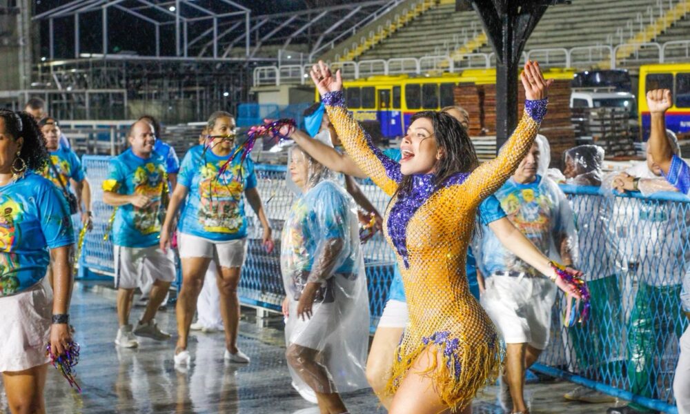 Nem a chuva que caiu parou a Madrinha da Escola Acadêmicos de Niterói, Thay Magalhães. A beldade marcou presença no ensaio técnico da agremiação, na Marquês...