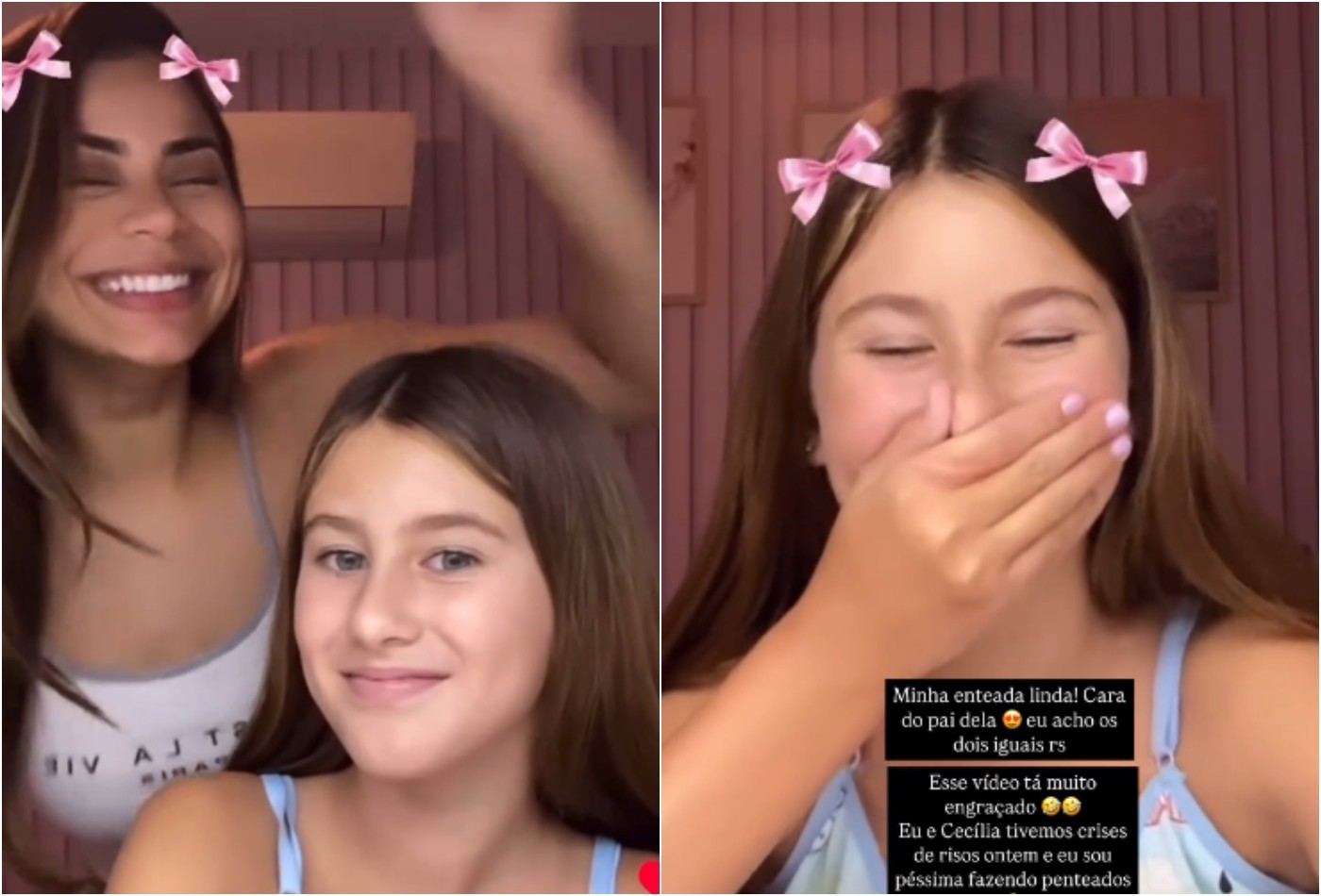 “Minha enteada linda! É a cara do pai, mas acho os olhos iguais (risos). Esse vídeo ficou muito engraçado. Eu e Cecília tivemos crises de riso ontem, e eu sou péssima fazendo penteados”, contou Lexa neste domingo (6).